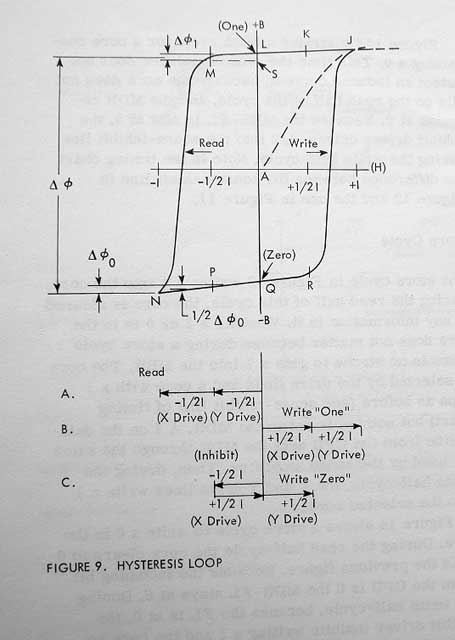 If the core is magnetised at "L" it stores the value (One), at "Q" it stores a (Zero).